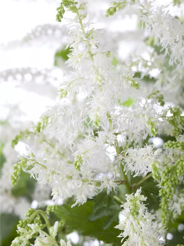 Astilbe x arendsii bildet in Rispen angeordnete, weiße, rosafarbene, rote Blüten ab Juli.
