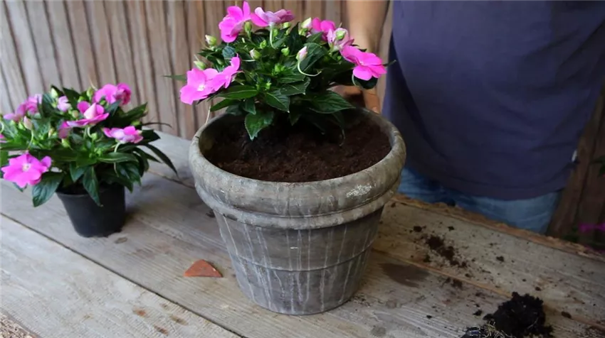 Wenn Sie die Edellieschen in ein größeres Gefäß umsetzen, entfernen Sie zunächst den alten Topf, damit die Pflanzen neue Wurzeln bilden können und sich so optimal mit Wasser und Nährstoffen aus der neuen Erde versorgen können.