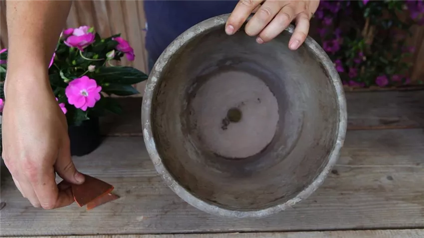 Bevor Sie handelsübliche Blumenerde in den Topf füllen, sollten Sie das Loch aber leicht bedecken: Zum Beispiel mit einer Tonscherbe. Diese verhindert, dass das Abzugsloch verstopft.