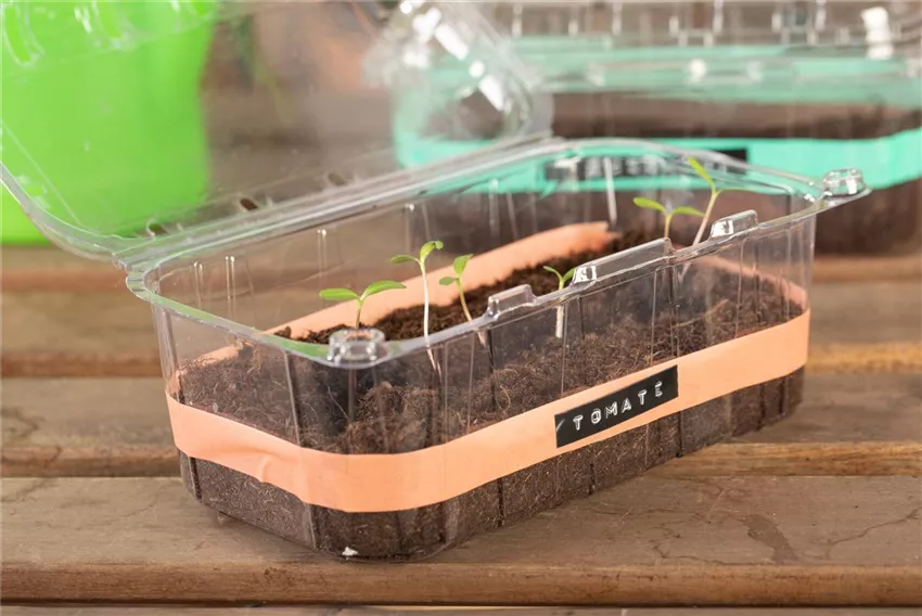 Weintrauben sind oft in einer Plastikschale verpackt. Wofür die gut sein soll, weiß man irgendwie nicht so genau, aber jetzt bekommt sie eine Aufgabe. Damit aus der Weintraubenschale ein Mini-Gewächshaus wird, wird die Schale ungefähr zu Hälfte mit Anzuchterde gefüllt. Anschließend werden die Samen eingesetzt und die Weintraubenschale gut gegossen. Die Erde sollte dabei feucht, aber nicht klitschnass sein. Anschließend wird der Deckel der Weintraubenschale geschlossen und das Mini-Gewächshaus auf eine sonnige Fensterbank gestellt. Falls im unteren Teil der Weintraubenschale Abtropflöcher vorhanden sind, kann das Mini-Gewächshaus auf einen Teller oder in eine Schale gestellt werden, damit es beim Gießen nicht für eine Überflutung sorgt. Ein Klebeband rund um die Schale kann beschriftet werden, damit man den Überblick behält, was wo wächst.